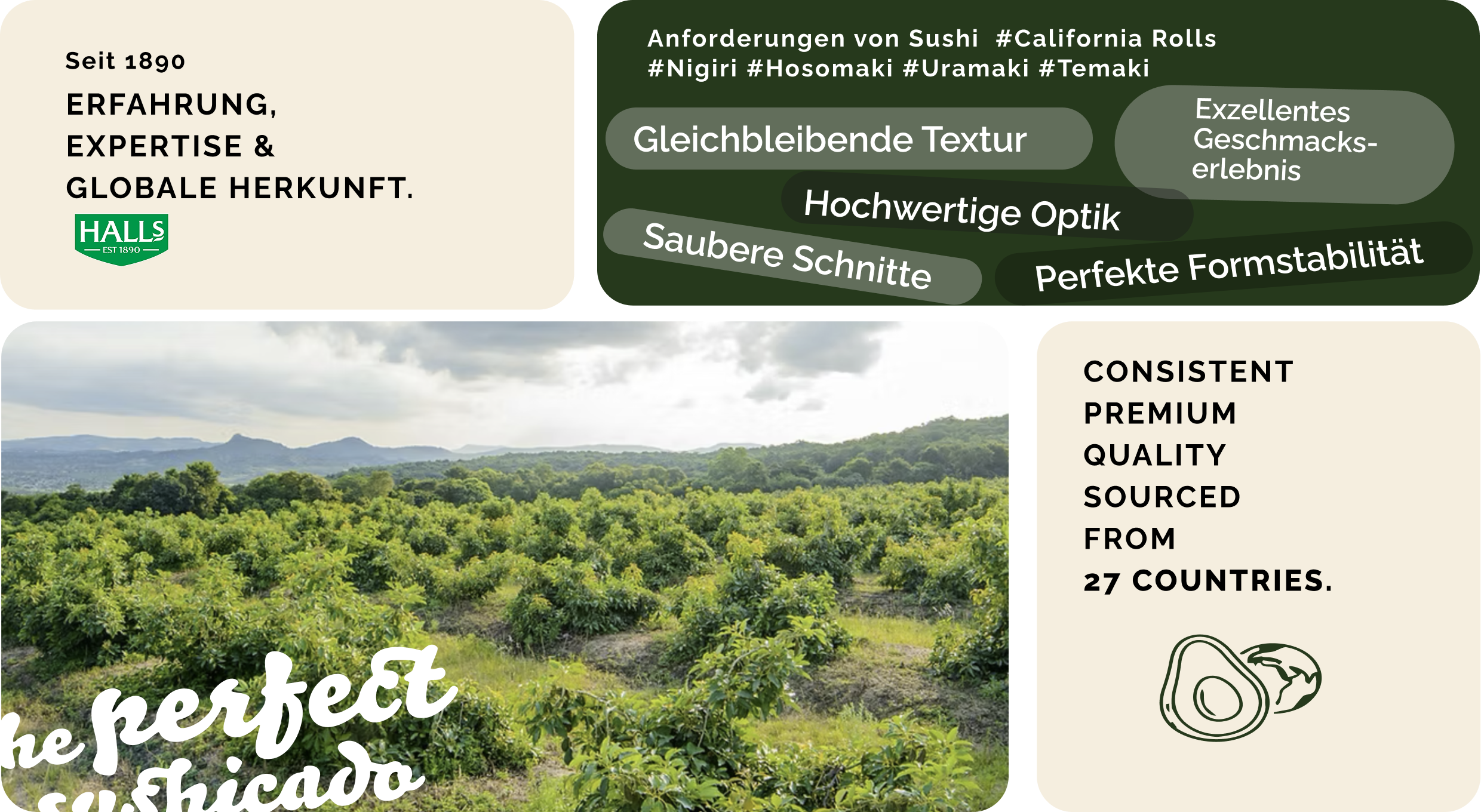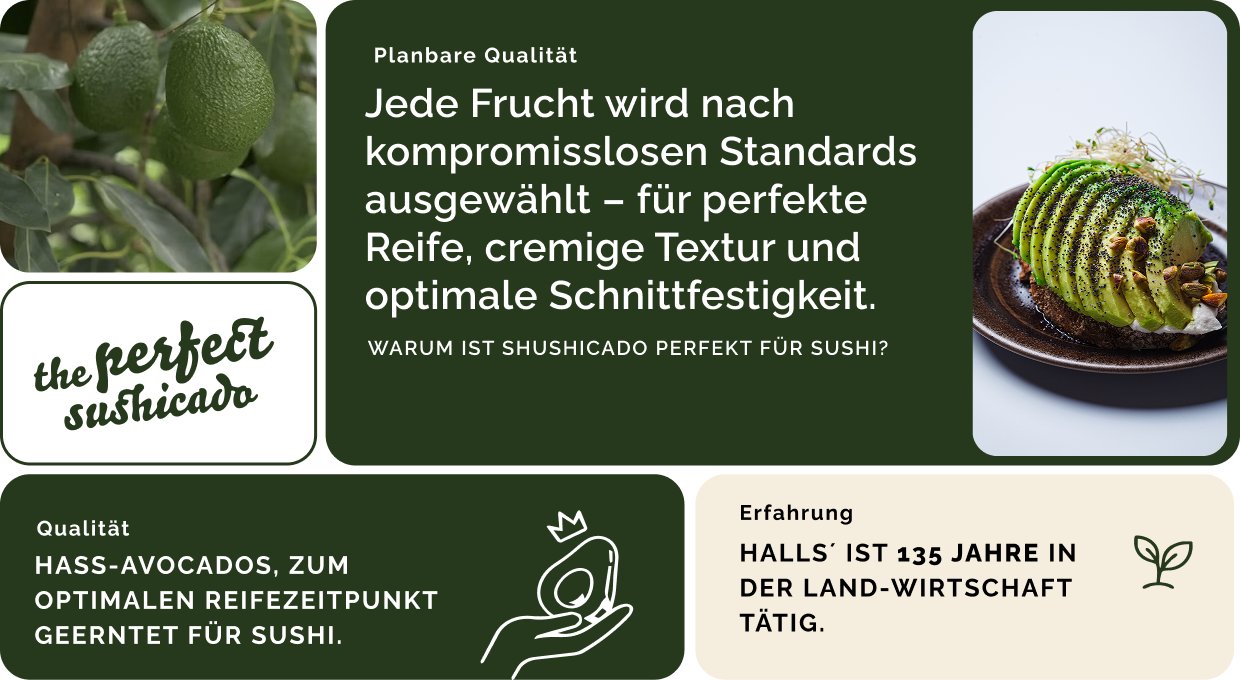 Sushicado arbeitet mit Halls zusammen, einem Avocado Spezialist mit 135 Jahre Erfahrung in der Landwirtschaft und über 40 Jahre Präsenz auf dem EU-Markt.