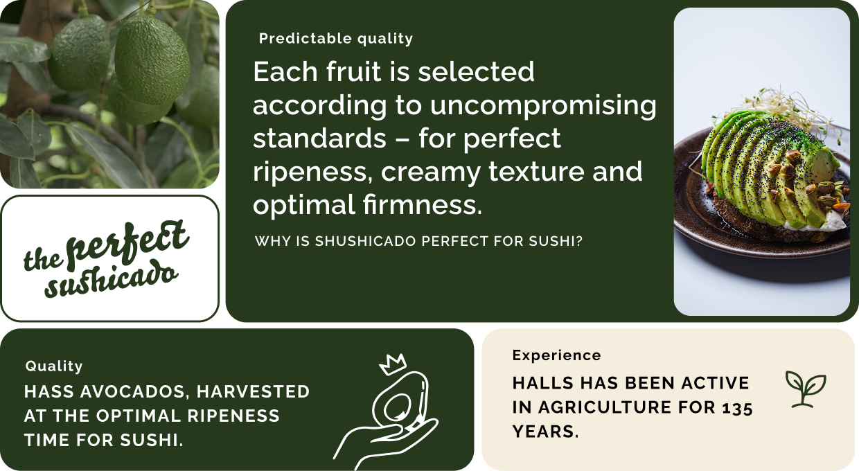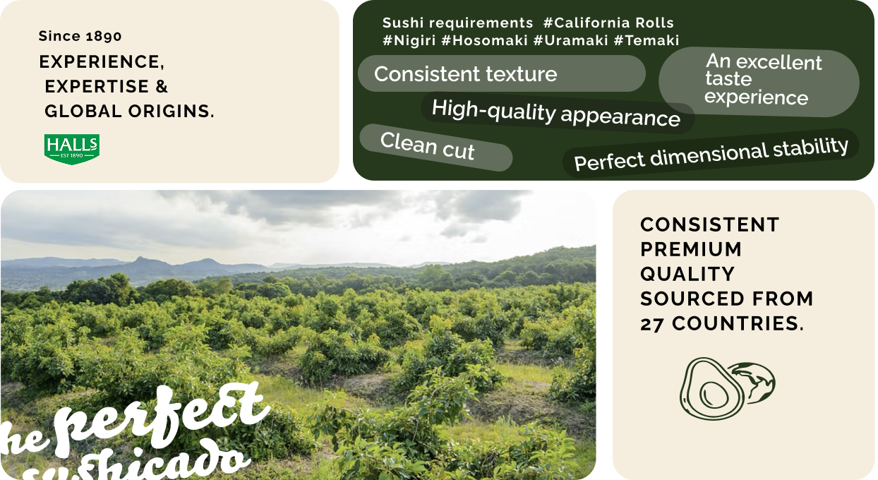 Sushicado works with Halls, an avocado specialist with135 years of experience in agriculture and over 40 years of presence in the EUmarket.